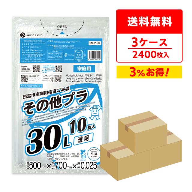 西宮市家庭用指定ごみ袋 その他プラ 30リットル 透明 50x70cm 0.025mm厚 10枚x80冊x3箱 SNSP-30-3/ ゴミ袋 ごみ袋 その他 プラ 家庭 30l 送料無料