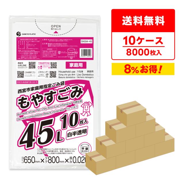 西宮市家庭用指定ごみ袋 もやすごみ 45リットル 白半透明 65x80cm 0.020mm厚 10枚x80冊x10箱 SNSM-45-10/ ゴミ袋 ごみ袋 可燃 家庭 45l 送料無料