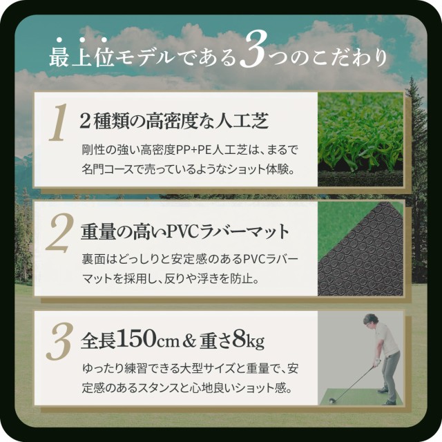 PGAプロ監修モデルのゴルフマットが登場!完全オリジナルの高品質・高密度人工芝と高重量PVCラバーマットを採用。まるで名門コースで打っているような体験を味わえます。