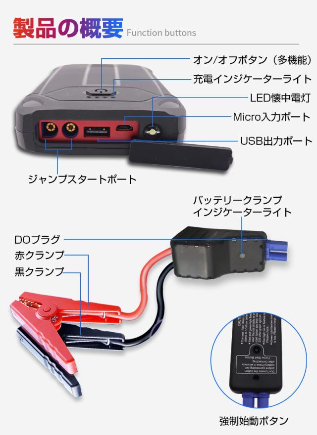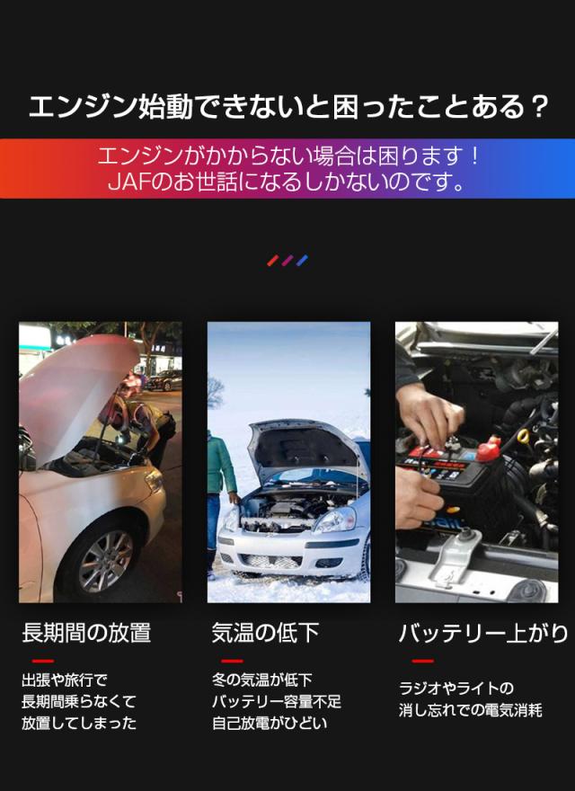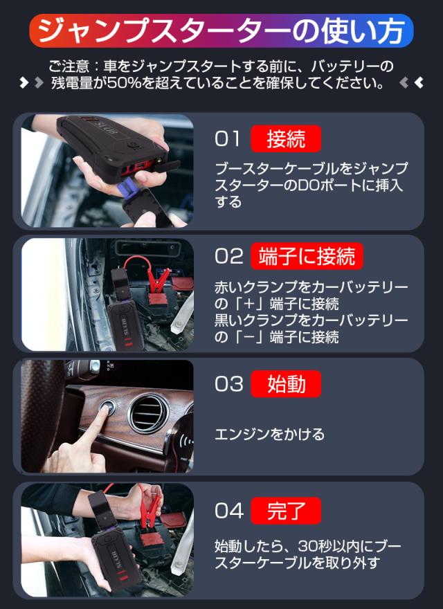 【素早く簡単にジャンプスタート】万が一のバッテリー上がりの事態でも助けを呼ぶ必要はありません。ご自身で簡単にジャンプスタートしエンジンの再始動が可能です。バッテリーの赤色の端子に赤のクリップを繋ぎ、黒色の端子に黒のクリップを繋ぐだけです。同じ色に同じ色のクリップを取り付けるだけで、あとはエンジンを始動すれば良いのです。