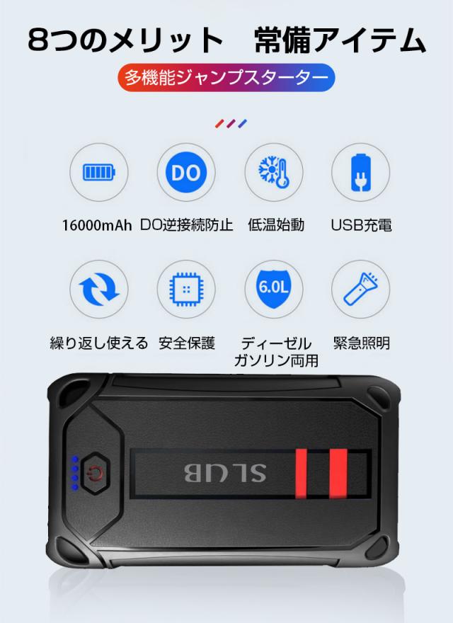 ジャンプスターター 12V車用 バッテリー上がり対策 iPhone17/16/15充電 防災電源 モバイルバッテリー役 16000mAh SOSモード IP66防水防塵 日本語取扱説明書付 【PL保険加入済み製品・安心】