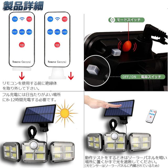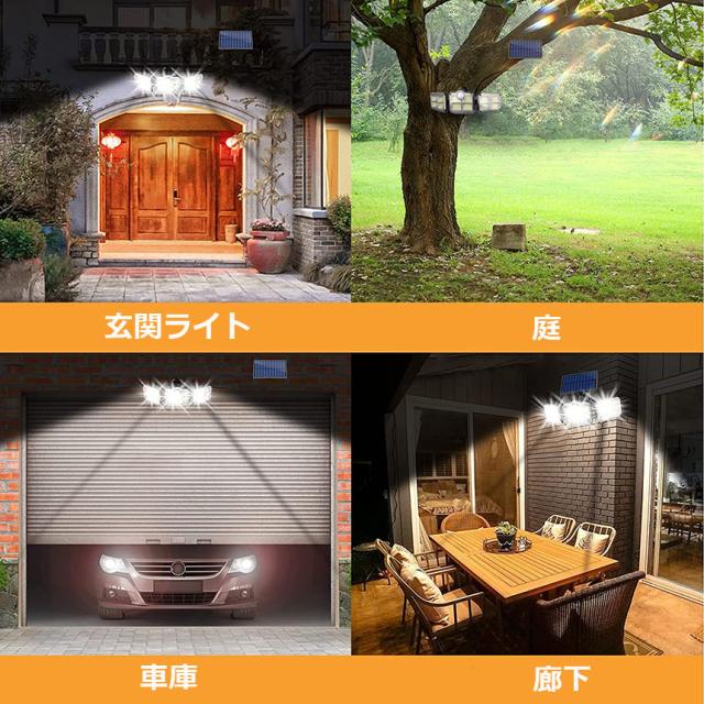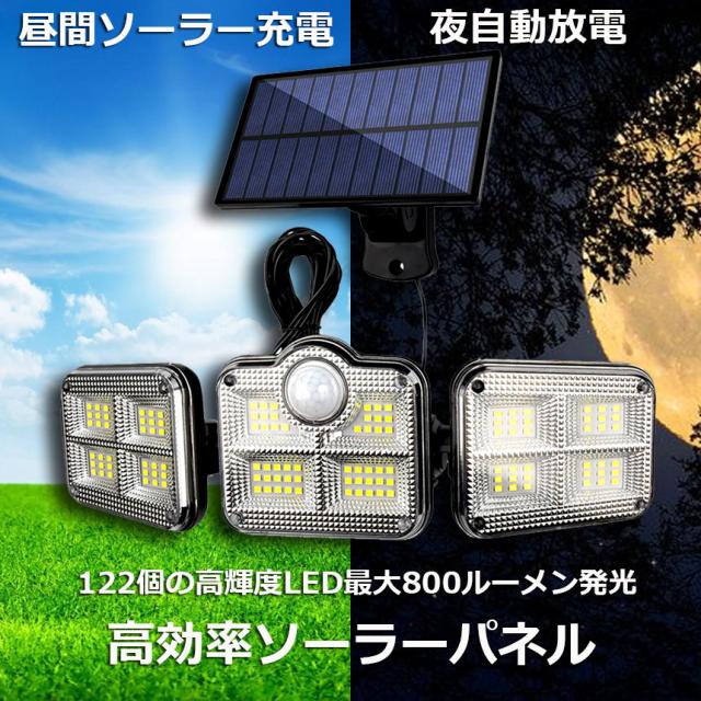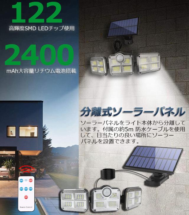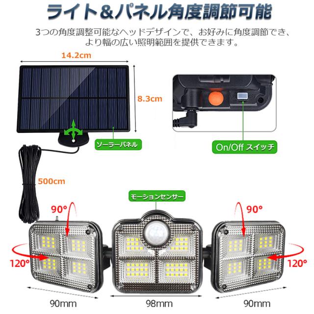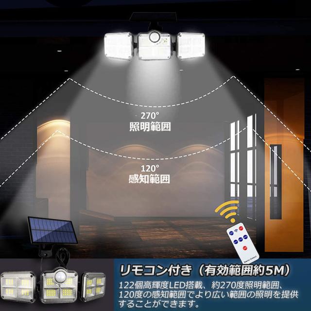 【122LED・3面発光・300°照明】 屋外ソーラーライトには800ルーメンを備えた122個のLEDチップが搭載しております。夜間の活動の安全性を確保するために、夜間により強い光を提供できます。3面発光のデザインで照明角度が300°に達すだけでなく、両側のライトは上下左右150°回転することができますから、照明が必要な場所で照明角度を自由に変えられます。ラーパネルの部分は上下左右150°の角度に調節できますので、太陽の良く当たる方へ向けられ、十分にソーラー充電できます。センサー検知角度が120°になりましたので、夜の防犯灯としてもすごく実用です。【5mコード付き分離型ソーラーセンサーライト】ソーラーパネルからライトまで5mのコードがあり、屋上でソーラーパネルを取り付けて、軒下や室内で本体を設置して使用することも可能なので、置き場所を選びません。動体センサーと明暗センサーがあって、昼間が自動的に消灯して、夜間に自動的に点灯します。