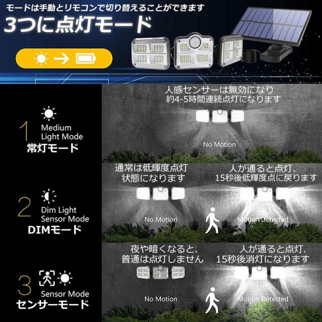 【三つ知能モード&リモコン付き】点灯消灯とモードはリモコンで操作となります。モード1:夜間で人を検知すると自動的に点灯します、人が離れると自動的に消灯します。モード2:夜間で自動的に薄暗く常灯します、人を検知すると全灯します、人が離れると薄暗いモードに戻ります。モード3:夜間で常灯します、人感センサーが効きません。