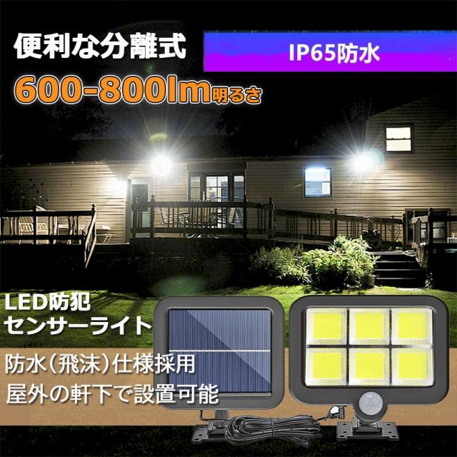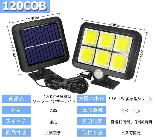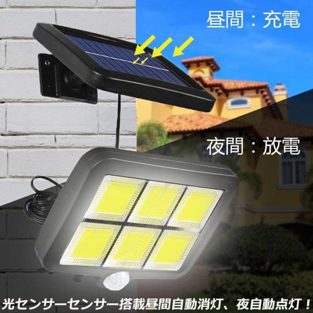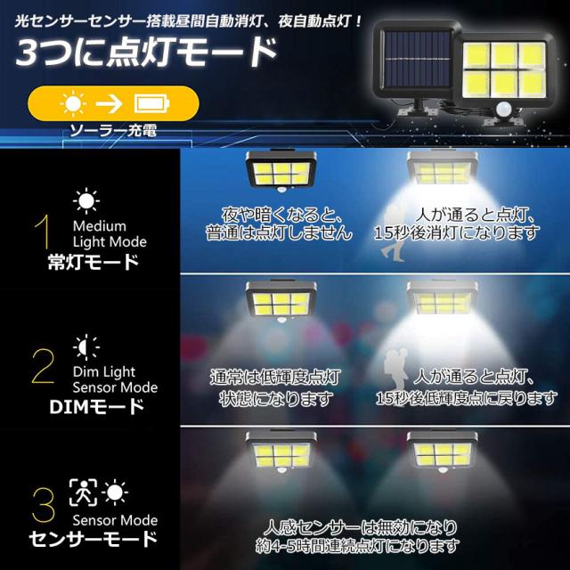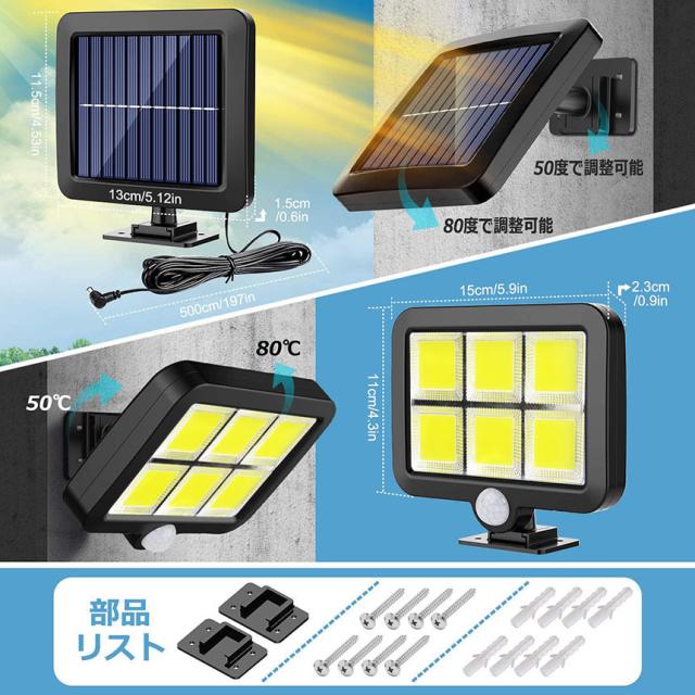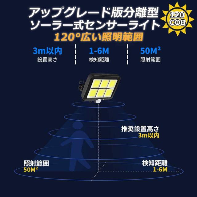 【分離式のソーラーパネル】従来のソーラーランプと比較して、ソーラーパネルをランプ本体から分離しています。付属の5m防水ケーブルを使用して、日当たりの良い場所にソーラーパネルを設置できます。日中は電力を節約し、夜は長くて明るい光を生成します。【120COBチップ採用】より明るいCOBのLEDソーラーライトにより、検出と照明角度は120°で、より広い照明エリアを覆うし、広い範囲で最大限に明るさを提供します。これにより、夜間でも通行人に明るく安全な環境が作り出されます。