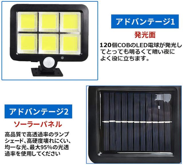 【120COBチップ採用】より明るいCOBのLEDソーラーライトにより、検出と照明角度は120°で、より広い照明エリアを覆うし、広い範囲で最大限に明るさを提供します。これにより、夜間でも通行人に明るく安全な環境が作り出されます。