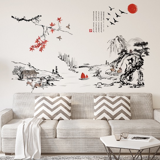 ウォールステッカー 日本風 水墨画 書画 風景 はがせる 壁紙シール 紅葉 松の木 漢字 家 舟 イラスト 簡単 DIY 新年 座敷 玄関 教室