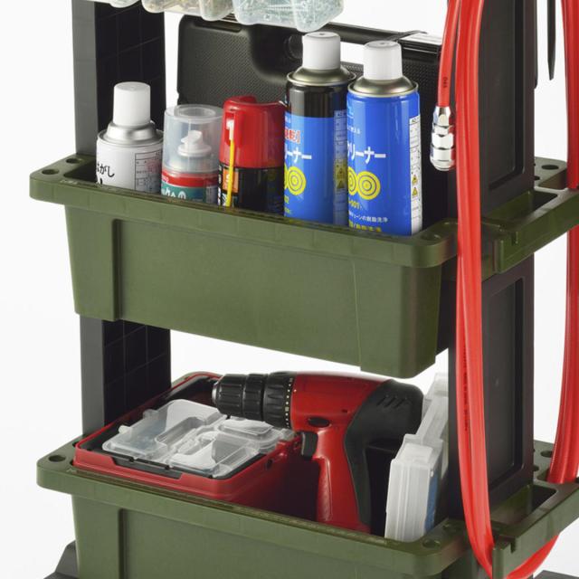 ボックス部分の耐荷重は1段あたり約10kgなので、工具類やスプレー缶など重いものもたっぷり収納ができます。