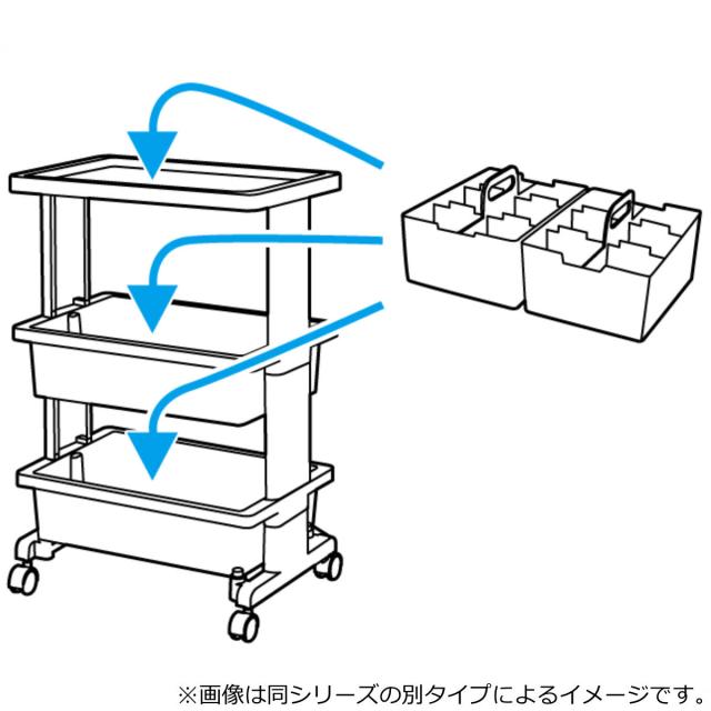ツールワゴンのワゴン1段に別売りのデスクトートが2個ぴったり収まります。一緒に組み合わせれば細かく種類別に分けて収納ができるため、見つけやすく取り出しやすくなり、より便利にお使いいただけます。