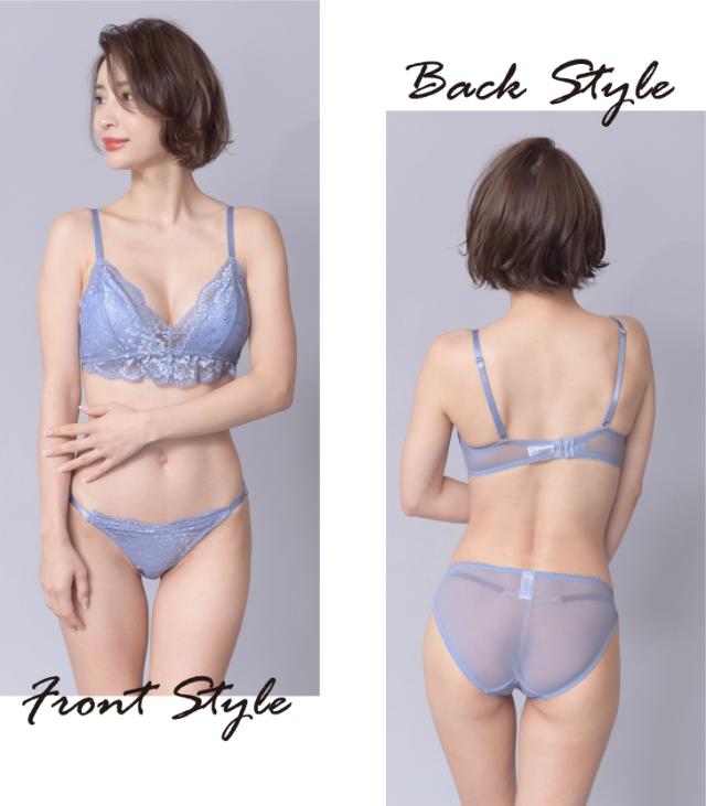 フローラルレースをふんだんに使用したゴージャスなノンワイヤーブラセット。アンダー部分のレースフリルはとってもキュートでアクセントに。ノンワイヤーなので締め付け感がなく、高めのサイドボーンでスッキリ安定。カップ裏のパネルが胸の横流れを防止します。ショーツサイドはストラップデザインでセクシーに肌魅せ。爽やかなサックスと大人なブラックの2色展開です。