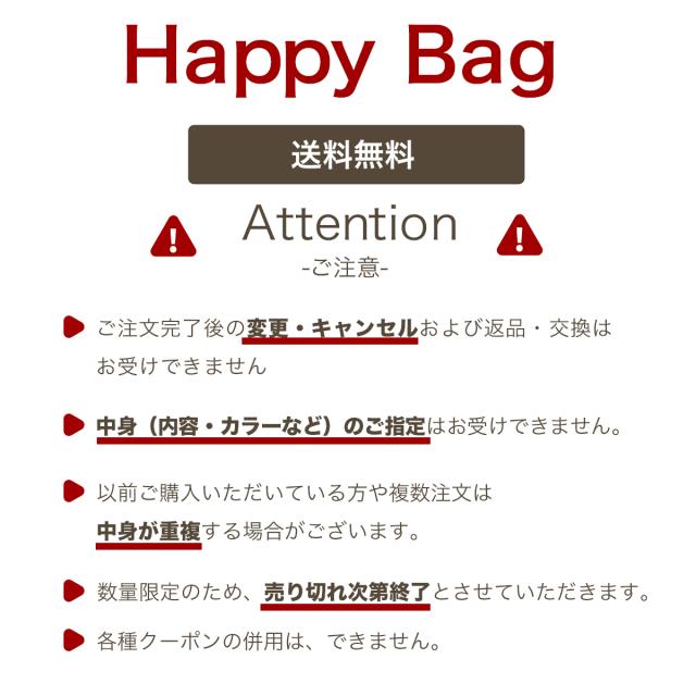 ・何が届くかわくわくしたい方 ・おまかせでハッピーバッグを購入したい ・ハッピーバッグで運試しをしたい方 ・サプライズプレゼントを検討中の方にもおすすめです! |