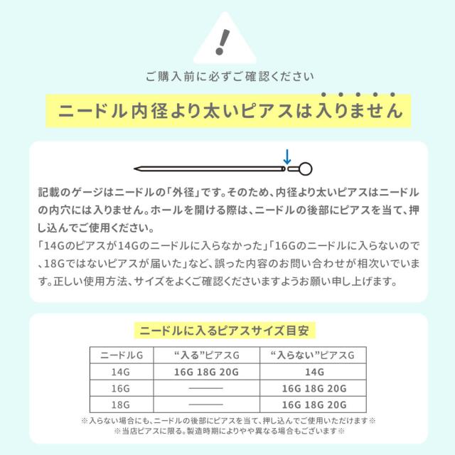 - 発送早くてすぐ届きました。 14Gのニードルに14Gのピアスは入らないとの記載があり、それを理解していたのに、間違えて14Gのピアスを買ってしまいました。しょうがないのでその日に近所のド◯キで16G...