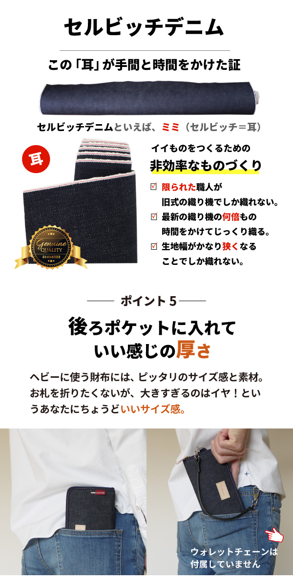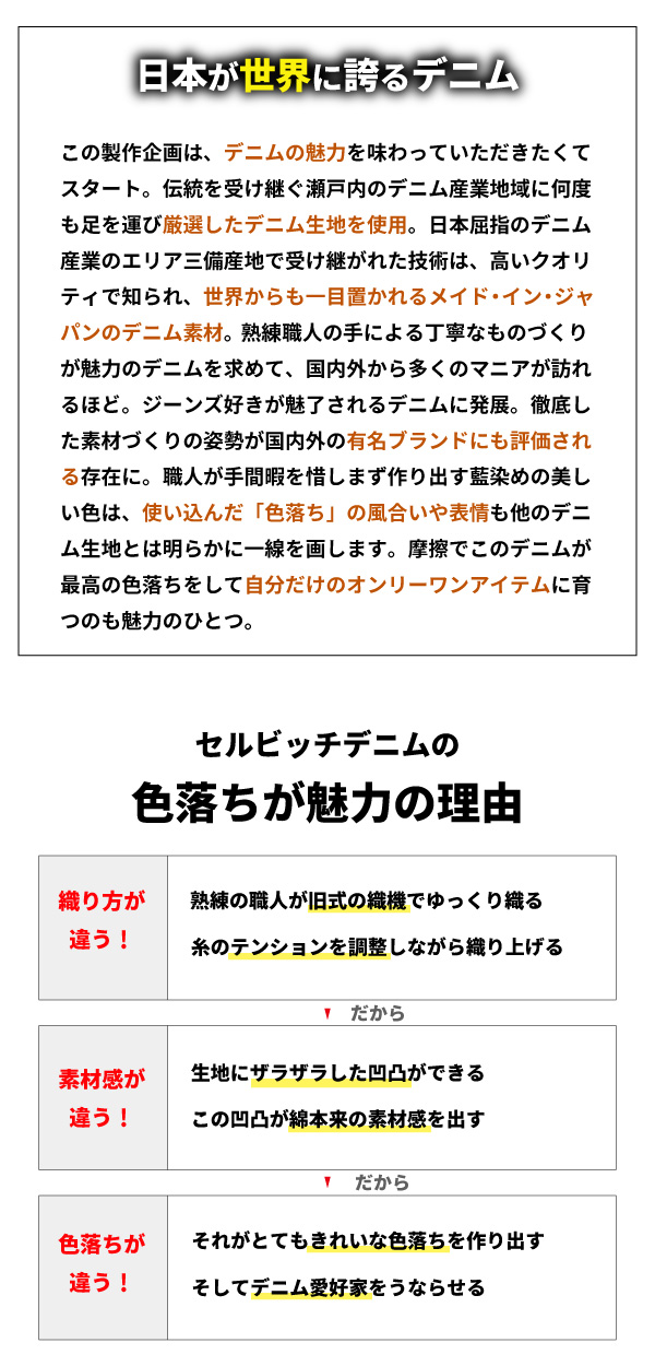 ■ポイント2、世界でも名高い日本製デニムから厳選したセルビッチデニム生地を使用