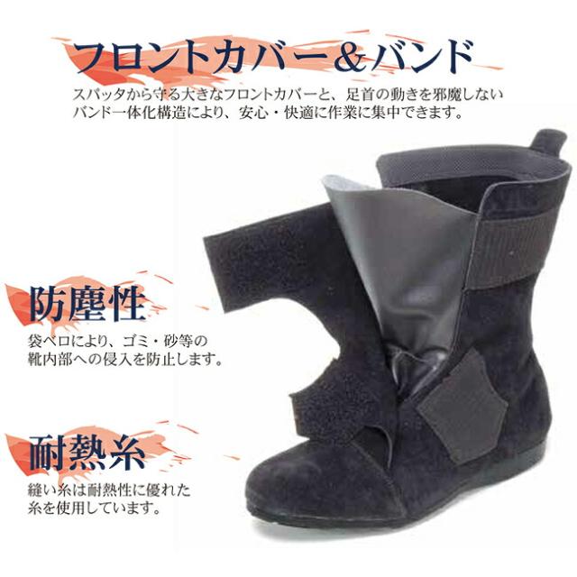 スパッタから守る大きなフロントカバーと、足首の動きを邪魔しないバンド一体化構造により、安心・快適に作業に集中できます。