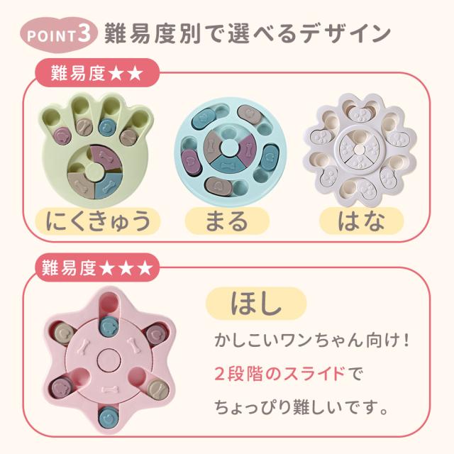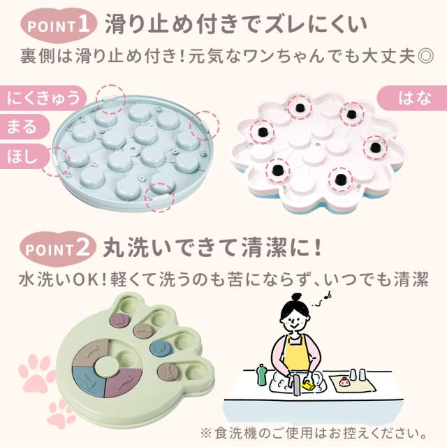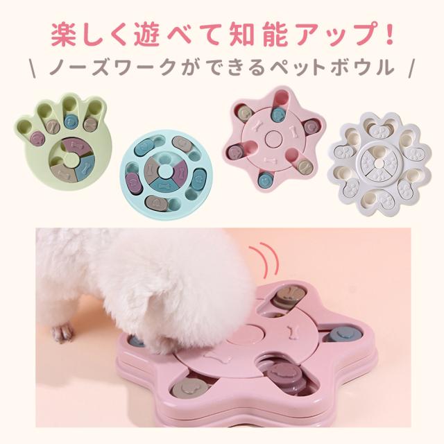 知育玩具/知育トイ/おもちゃ/オモチャ/犬/イヌ/わんちゃん/ワンちゃん/ペット用/早食い/早食い防止/スローフード/ノーズワーク/フードボウル/フードボール/おやつボール/ペットフード/ドッグフード/ペット用品/トリーツ/ゲーム/ご飯/エサ/エサ入れ/餌入れ/小型犬/中型犬/しつけ/認知症/防止/トレーニング/訓練/丸洗い/丸洗い可能/滑り止め/すべり止め/かわいい/パステルカラー/くすみ/肉球/丸/円形/星/グリーン/ブルー/ピンク/