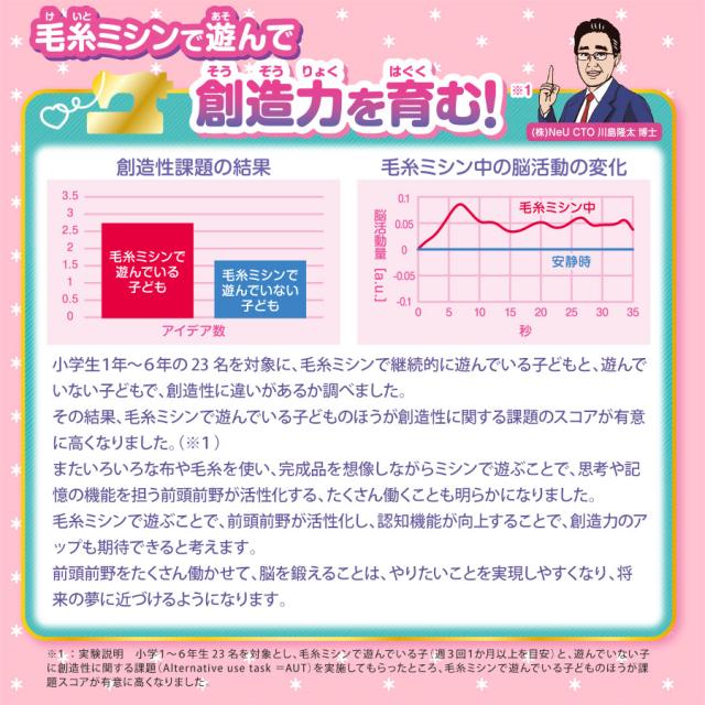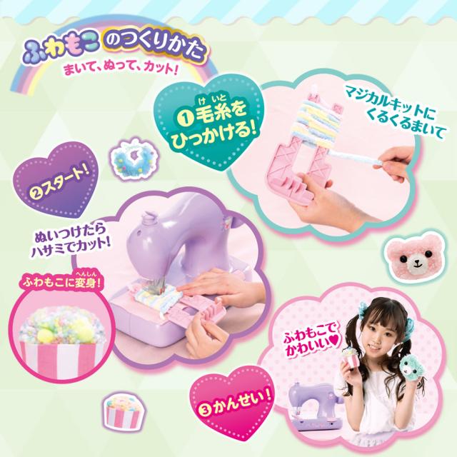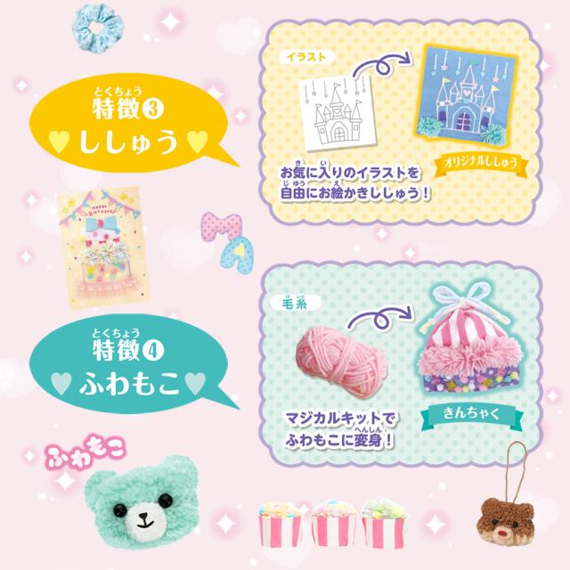 | 付属品 | ミニバッグキット、マスコットキット、わた、毛糸3種類(並太:ピンク、黄、白)、ゴムひも、綿生地、チュール、マジカルキット、型紙、一年中いつでも遊べるレシピ本、取扱説明書 |