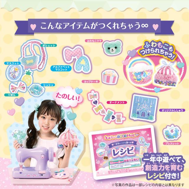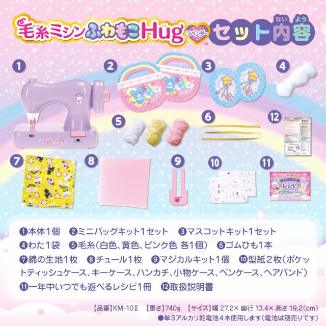 ● 商品情報 毛糸ミシンふわもこHugラベンダー KM-10ll● サイズ【本体】幅:272mm×高:192mm×奥:134mm【梱包】幅:350mm×高:290mm×奥:150mm● 重量約740g ★対象年齢6歳以上 ● 付属品 ミニバッグキット、マスコットキット、わた、毛糸3種類(並太:ピンク、黄、白)、ゴムひも、綿生地、チュール、マジカルキット、型紙、一年中いつでも遊べるレシピ、取扱説明書