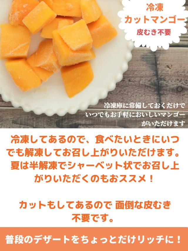 いつでも食べたい時に!完熟カットマンゴー! 適度な一口サイズにカット済みです! 冷凍庫にあれば解凍するだけでいつでも便利においしいマンゴーをお召し上がりいただけます。