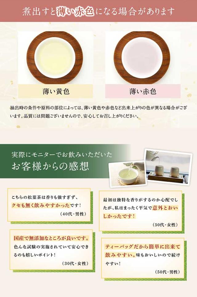 - 初めは、違和感(松の香り)のあるお茶でしたが、回数を重ねていくと気にならなくなり違和感なく飲めるようになりました。