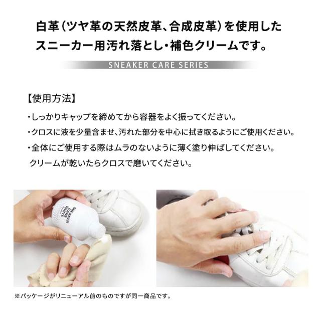 白革(ツヤ革の天然皮革、合成皮革)を使用したスニーカー用汚れ落とし・補色クリームです。