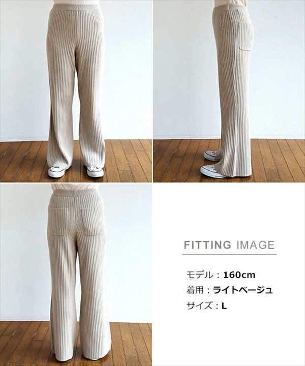 リブニットパンツ フレアパンツ リブニット フレア パンツ ニットパンツ ウエストゴム レディース リラックス ストレッチ レイヤード バックポケット スタイルアップ M/Lサイズ 楽ちん ゆったり Ladies bottoms pants ブラック 黒 ベージュ グレージュ ブラウン グリーン