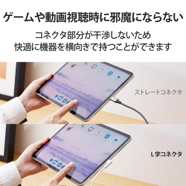 L字コネクタの採用により、飛び出しが少ないスッキリした配線が可能です。USB2.0の規格である「CertifiedHi-SpeedUSB(USB2.0)」の正規認証品。USBType-C(TM)端子を搭載したパソコン・充電器と、USBType-C(TM)端子を搭載したスマートフォンなどの接続ができるUSB2.0ケーブル。