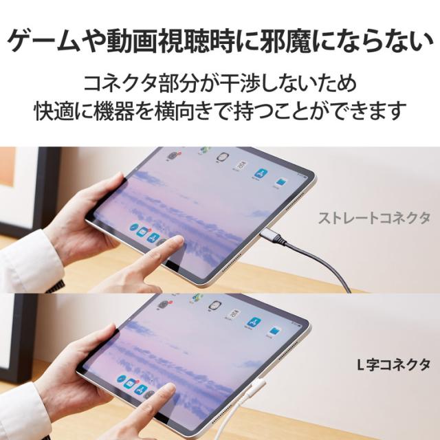 L字コネクタの採用により、飛び出しが少ないスッキリした配線が可能です。USB2.0の規格である「CertifiedHi-SpeedUSB(USB2.0)」の正規認証品。USBType-C(TM)端子を搭載したパソコン・充電器と、USBType-C(TM)端子を搭載したスマートフォンなどの接続ができるUSB2.0ケーブル。
