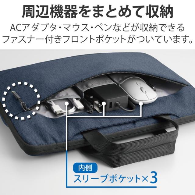 ■ACアダプタ・マウス・ペンなどの周辺機器をまとめて収納できるフロントポケットがついています。ポケット内部には、収納物の整理に便利なスリーブポケットを備えています。