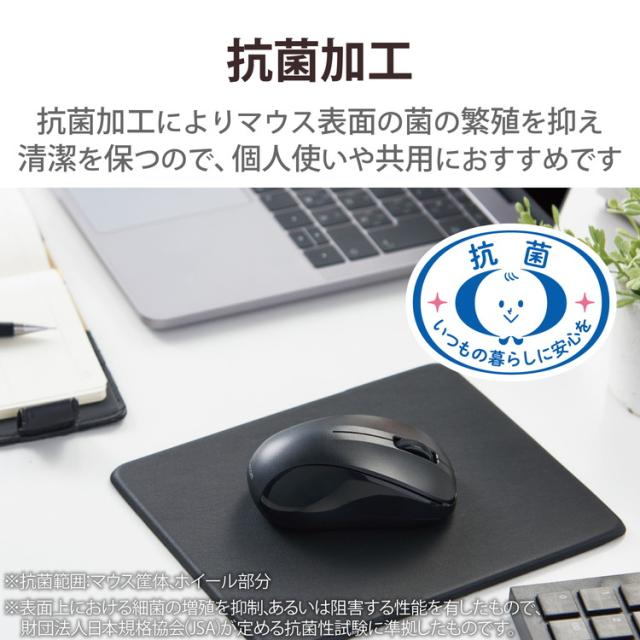 ■抗菌加工によってマウス表面の菌の繁殖を抑え、清潔に保てるため、個人使いはもちろん共用にもおすすめです。(抗菌範囲:マウス筐体、ホイール部分)※2