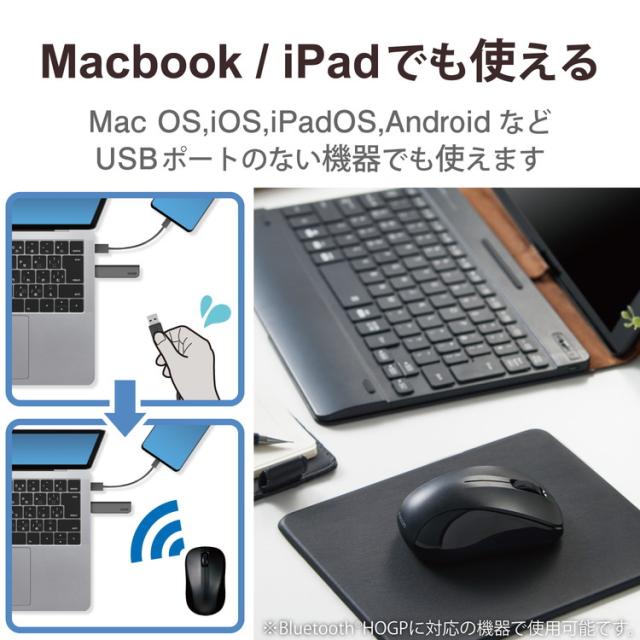 ■Bluetooth(R)HOGPに対応したパソコンなどの端末で、USBポートをふさがずに接続できます。レシーバが不要なため、USBポートが少ない薄型パソコンやタブレットをスマートに使いこなせます。※1