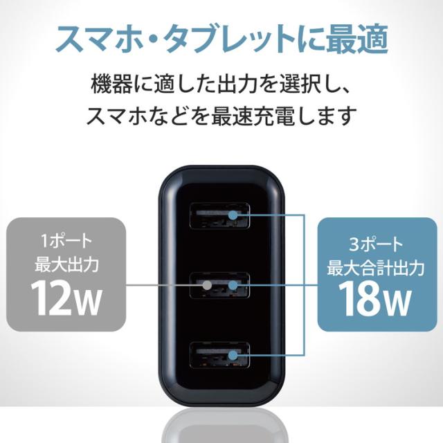 iPhone充電器 AC充電 3.6A出力 USB 3ポート 合計18W ブラック スマホ タブレット おまかせ充電 MPA-ACU12BK エレコム(代引不可)