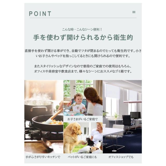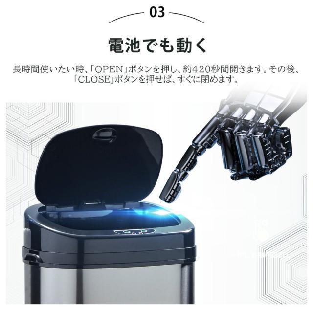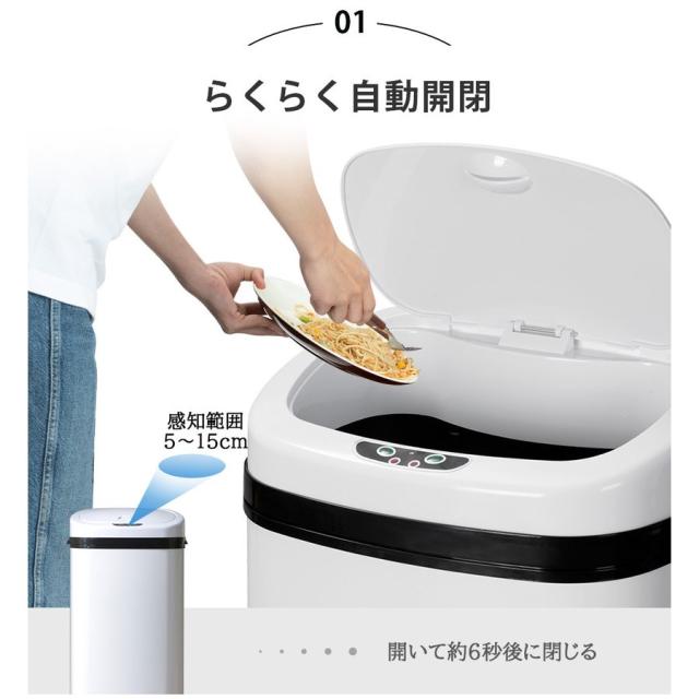 【自動開閉センサー調節機能】開閉センサーが反応する範囲 (5~15cm) を、開いて約6秒後に閉じます。※ゴミ箱の感知に支障が出ない様に、直接日光は避け、感知所に異物が付着しないようにしてください。