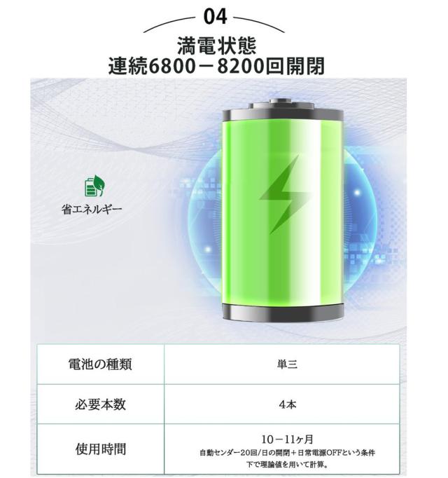 【省エネルギー仕様】単3形電池4本で「連続6800-8200回開閉」ご使用いただけます。自動センサー1日20回ゴミ箱開閉+日常電源OFFという条件下で理論値を用いて計算すれば、使用期間が「10-11ヶ月」となります!