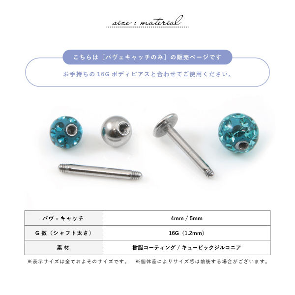 キャッチ ボディピアス 16G パヴェ 4mm 5mm ジュエル 軟骨ピアス ヘリックス トラガス 樹脂 コーティング ボディピアス 片耳 軟骨 耳たぶ かわいい キラキラ 金属アレルギー対応 つけっぱなし ネジ式 替え玉 カスタム ストレートバーベル ラブレット スパイラル 予備