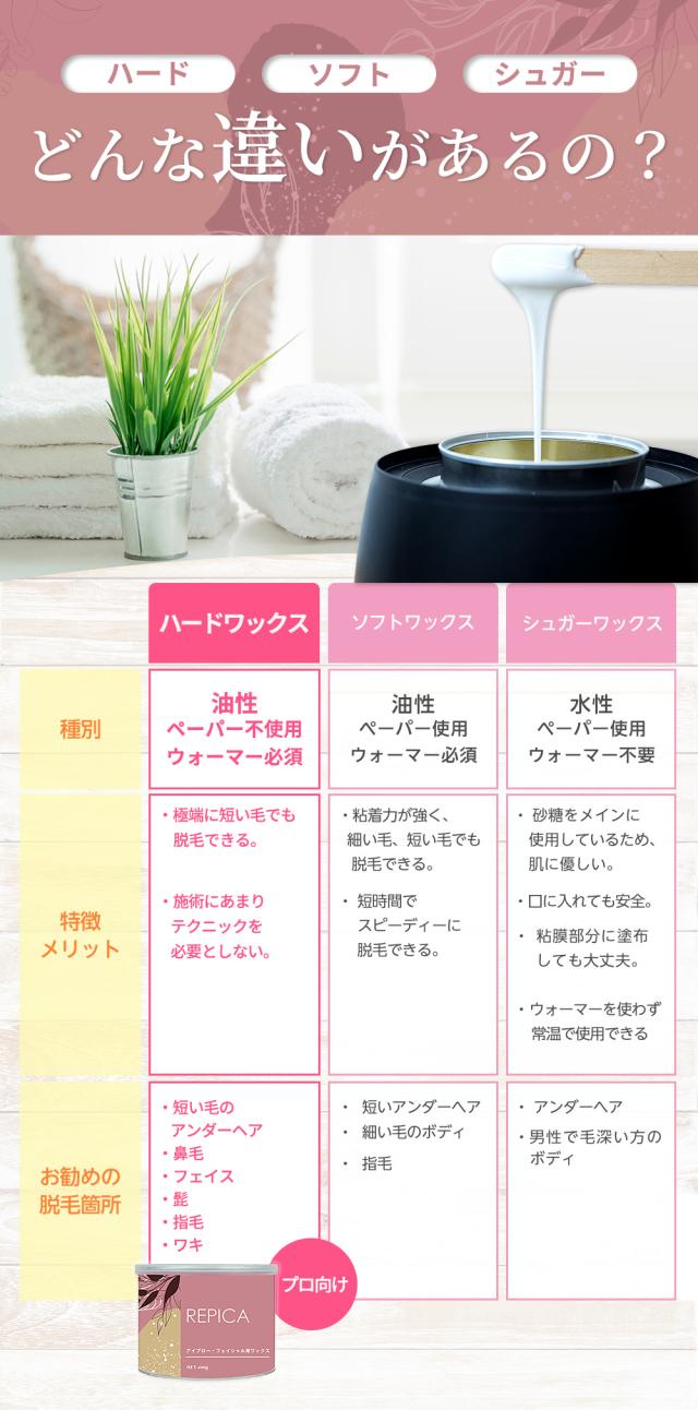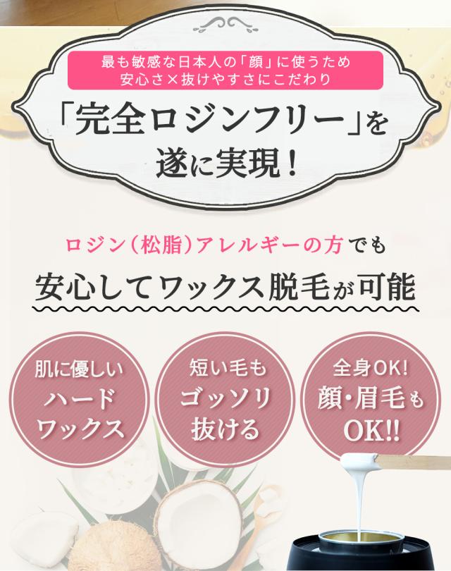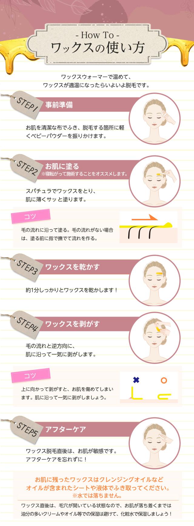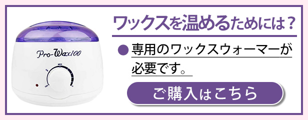 | 使用方法 | 本商品は専用のヒーターで温めてから使用します。常温では使用できません。 1.本商品のキャップを外し、中蓋を開け缶をヒーターにセットします。 2.ワックスを温めます。適温は45度です。 ※温めすぎるとやけどをする恐れがあります。十分ご注意ください。 3.スパチュラ等でワックスをすくい、毛の流れに沿って肌に薄く塗布します。 4.ワックスが固まるまで数十秒待ちます。 5.ワックスが固まったら、毛の流れとは逆方向に肌に沿って一気に剥がします。 ※上に向かって剥がすと危険です。 6.剥がした部分をすぐに指や手のひらで押さえ、痛みを和らげます。 以降3〜6の繰り返し |