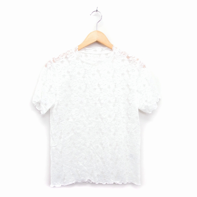 【中古】ジーユー GU カットソー シャツ ブラウス ノーカラー 丸首 半袖 かぎ針編み 花 柄 L ホワイト 白 /HT19