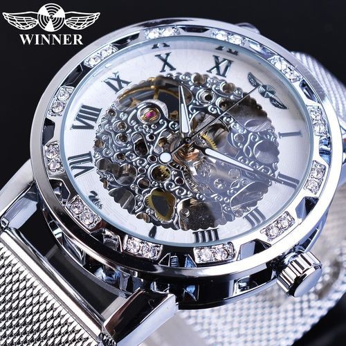WINNER ゴールデンウォッチ男性スケルトン機械式時計クリスタル メッシュスリム ステンレススチールバンド腕時計 W1089-8