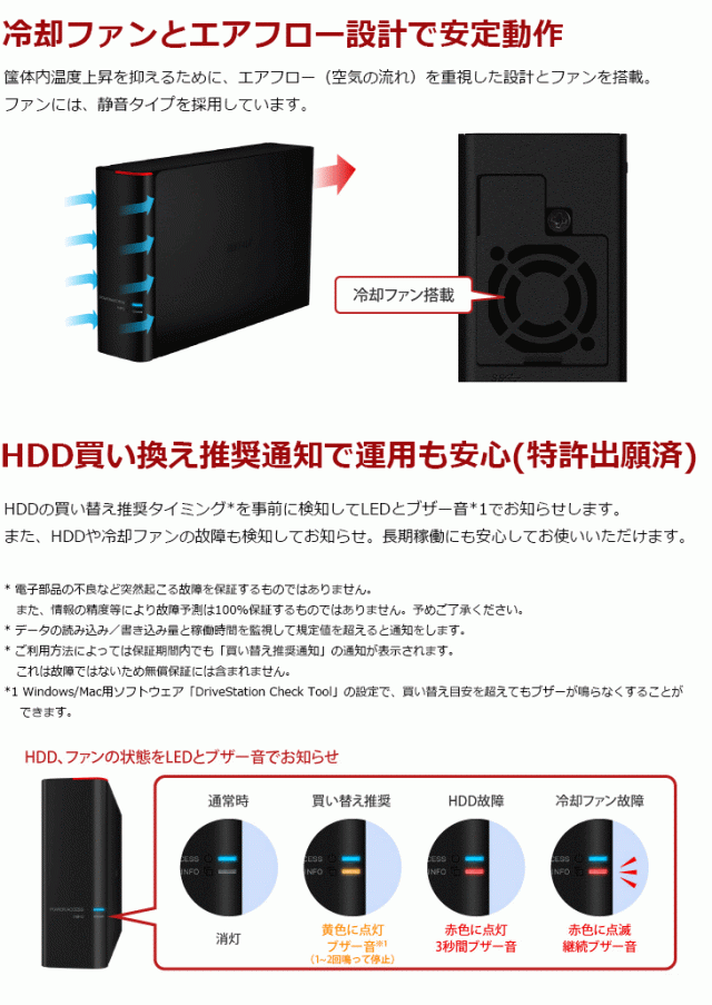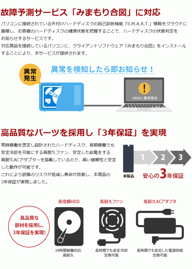 高品質な部材を採用、冷却ファンとエアフロー設計で安定動作で、3年間の長期保証を実現しました。また、HDDお取り換え推奨サインで、お客様にHDDのお取り換え推奨タイミングをお知らせします。