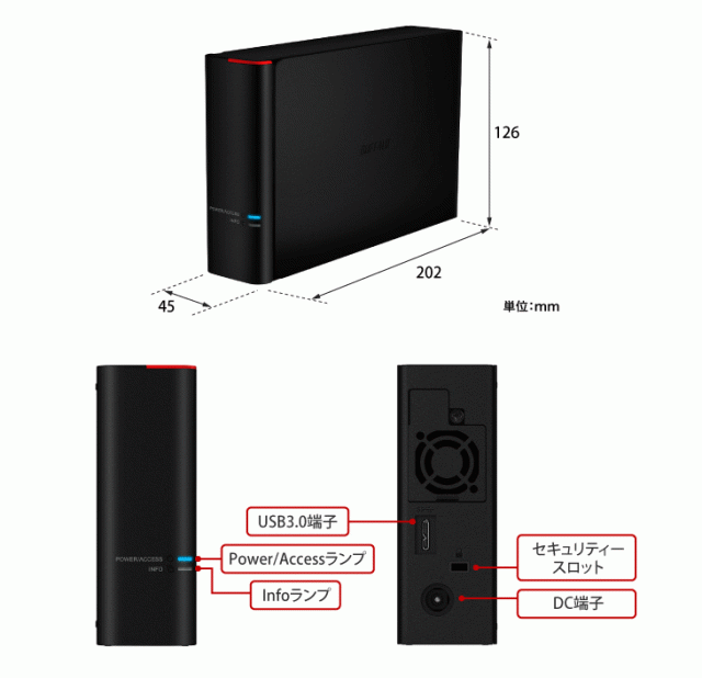 | 主な付属品 | USB3.0ケーブル(A to micro B 1m)、ACアダプター、クランプ(電源ケーブル抜け防止用)、取扱説明書、保証書 |