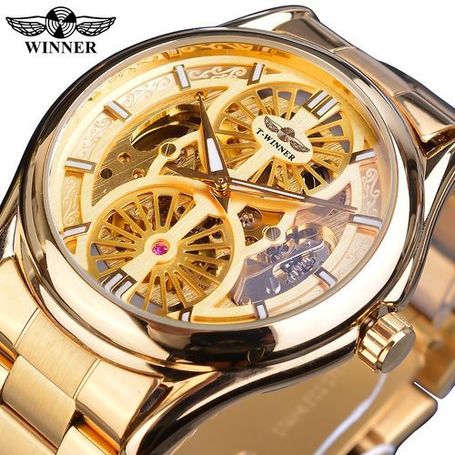 Winner 腕時計ゴールデンニューメン自動中空透明機械式男性スチールバンド時計 Golden