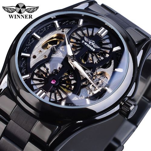 Winner 腕時計ゴールデンニューメン自動中空透明機械式男性スチールバンド時計 Black-Silver