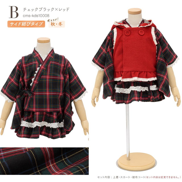 七五三 着物 三歳 キッズ 着物ドレス 被布コート セット ボア セパレート 赤 黒 ベージュ チェック フード付き 90 100 女の子 女児 送料無料