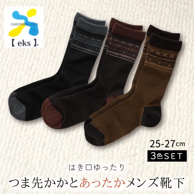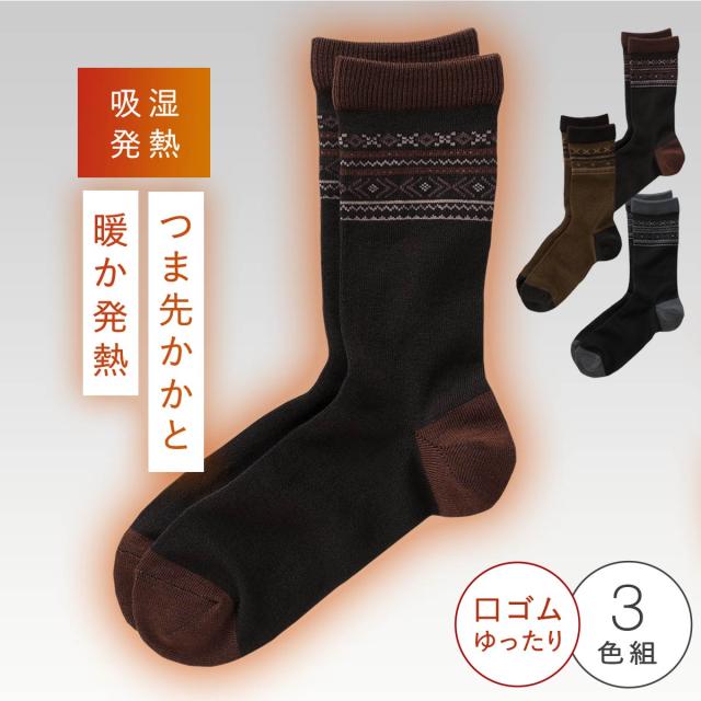 靴下 メンズ 3色組 25-27cm 丈長 吸湿発熱 あったか 履き心地 ベーシックカラー おしゃれ つま先・かかとあったかメンズカジュアルソックス 3色組