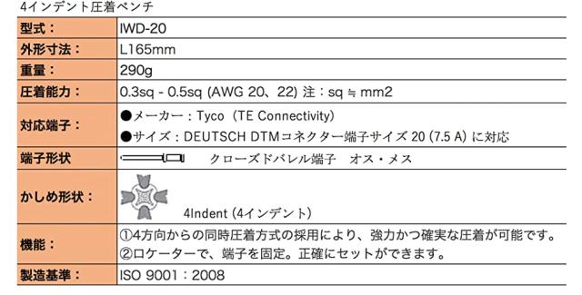 IWISS ソケットコンタクト 4インデント 圧着ペンチ 自動車用 DEUTSCH DTM コネクタ クローズドバレル端子 圧着工具 AWG 20、22対応 IWD-20
