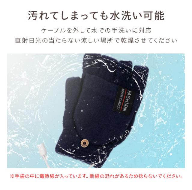 | 特徴 | デスクワークや勉強、裁縫や読書などの趣味の時間。手がかじかんで思うように動かなかったり、冷えのせいで集中できなかったりしませんか? そこでこちらの「USB電熱手袋」。USB電源があるところでなら、お好きな場所で手の甲側・手のひら側の両面からポカポカとあたためてくれます。 やわらかくふわふわとしたニット素材で保温効果も◎。 モバイルバッテリーを使用すればお家やオフィス以外の屋外でも使用できます。電源を使用せず、ケーブルを手袋の中に隠して手袋だけでも使用可能です。 指先に生地のない指なしタイプの手袋で、キーボード操作など細かい作業もしやすくスマホのタッチ操作も可能。 手の甲側にあるボタンからカバーを外すと、お好みでミトン手袋にもなる2WAYデザイン。指先まで覆うことであたたかさアップ。 ケーブルにはリモコン付き。電源のON・OFFだけでなく、3段階の温度調節に3つのタイマー設定が可能。 タイマーは電源ONと同時に必ず設定されるので、万が一電源を切り忘れても自動的に電源がOFFになる安心仕様。 汚れてしまってもケーブルを取り外してそのまま水での手洗いOK。いつでも清潔に使用することができます。 男女問わずお使いいただけるフリーサイズのユニセックスデザイン。(メンズ・レディース兼用)。シンプルなのでビジネスシーンにもオススメです。 |