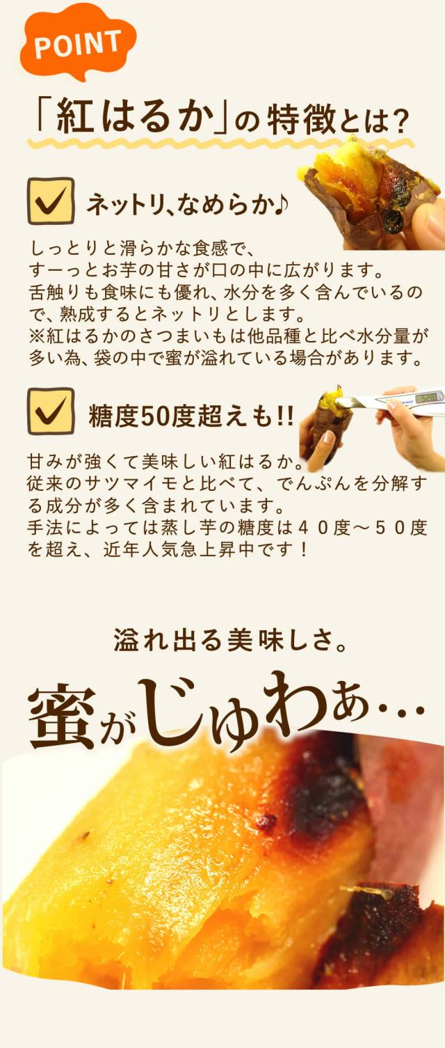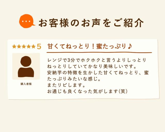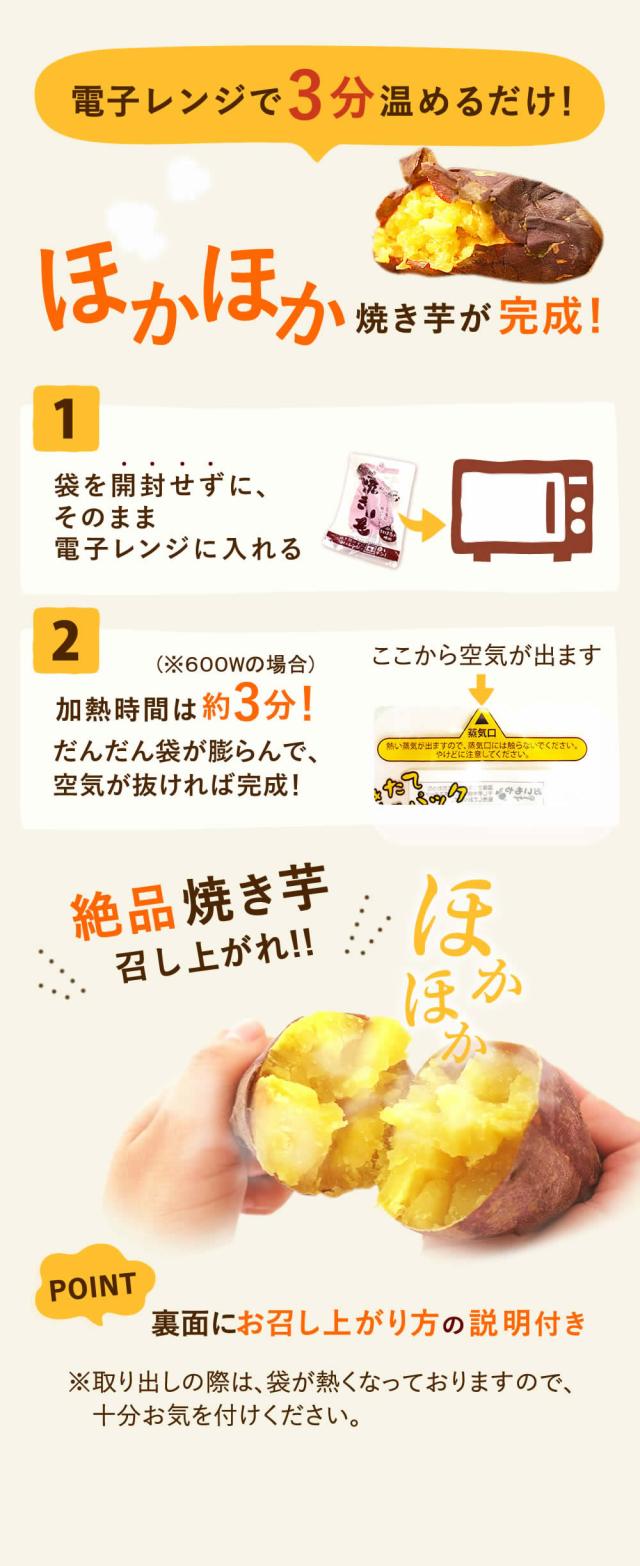 | その他 | ○赤字価格の為、【ラッピング不可】【簡易包装】でお届け致します。ご自宅用としてご利用下さい。 ○電子レンジでの調理時間は目安となります。 製品により、多少前後する場合がございます。予めご了承くださいませ。 ○お芋の保存状態を保持するために、お芋の両端はカットさせて頂いております。 ○お芋の種類やお届の時期によっては、お芋の糖化が進んでいるため、お芋の蜜が袋の内側に付着している場合がございます。 |