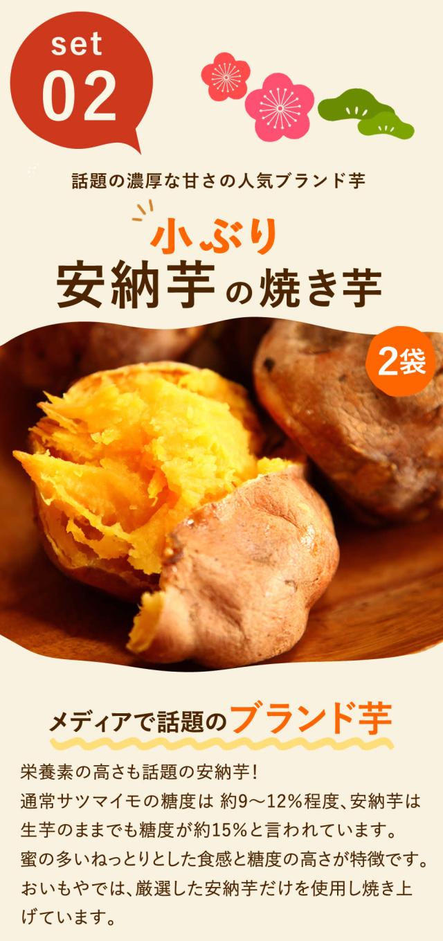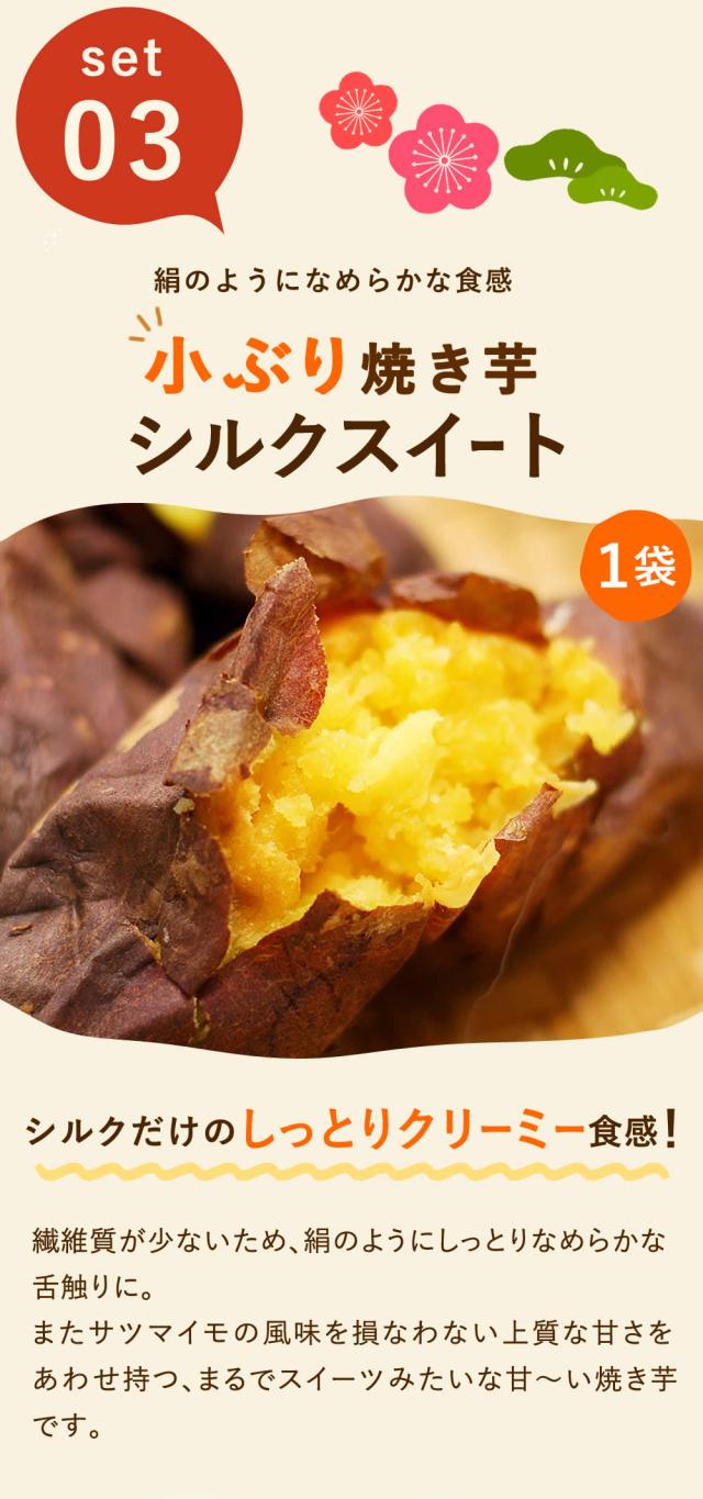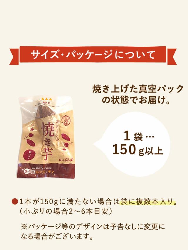 ○紅はるかの焼き芋 2袋 ○安納芋の焼き芋 2袋 ○シルクスイートの焼き芋 1袋 ◎1袋あたり150g以上 ※小さいサイズは袋に2〜3本入りになります |
