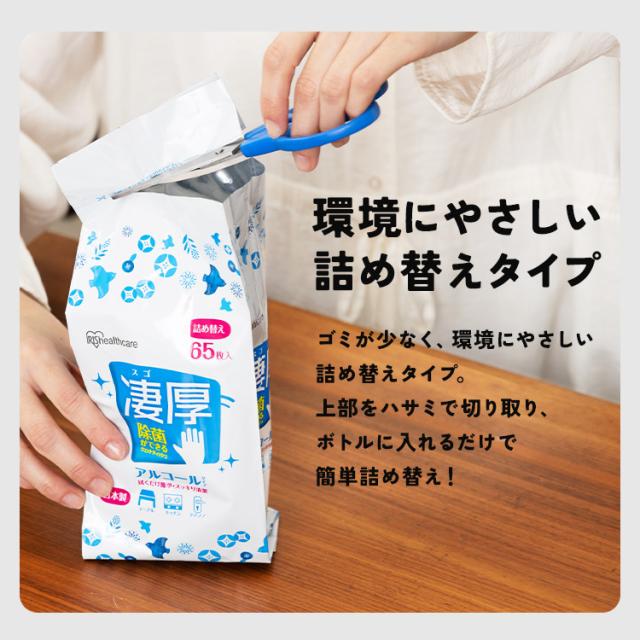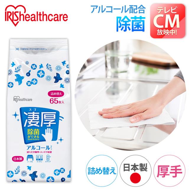 ウェットティッシュ 除菌シート アルコール アイリスオーヤマ * 凄厚 WTT-65A 65枚入 詰め替え ボトル 詰替 除菌 大判 日本製 新生活 ウェットシート アルコールタオル エタノール 蓋 ふた 携帯 キッチン 厚手 防災 手口ふき 業務用 備蓄 家庭用 厚い