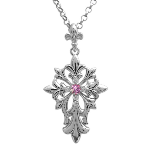 9月誕生石ピンクサファイアを使用したプラチナ製の、クロス&ユリの紋章デザイン・メンズネックレスペンダントです。