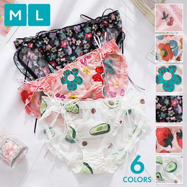 北欧風 ショーツ レディース 花柄 フルーツ 透け感 メッシュ サイド リボン フリル 花 チェリー いちご 苺 果物 シースルー シフォン メローフリル サイドリボン 女性 パンティー レディースショーツ インナー 下着 肌着 メロウフリル かわいい おしゃれ 伸縮性 通気性