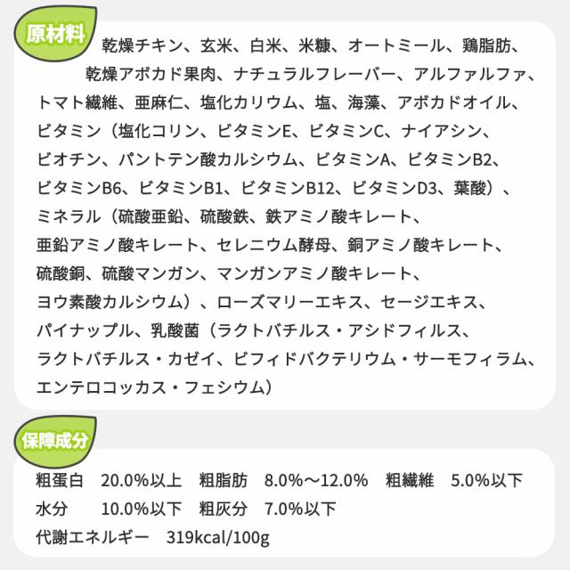 乾燥チキン、玄米、白米、米糠、オートミール、鶏脂肪、乾燥アボカド果肉、ナチュラルフレーバー、アルファルファ、トマト繊維、亜麻仁、塩化カリウム、塩、海藻、アボカドオイル、ビタミン(塩化コリン、ビタミンE、ビタミンC、ナイアシン、ビオチン、パントテン酸カルシウム、ビタミンA、ビタミンB2、ビタミンB6、ビタミンB1、ビタミンB12、ビタミンD3、葉酸)、ミネラル(硫酸亜鉛、硫酸鉄、鉄アミノ酸キレート、亜鉛アミノ酸キレート、セレニウム酵母、銅アミノ酸キレート、硫酸銅、硫酸マンガン、マンガンアミノ酸キレート、ヨウ素酸カルシウム)、ローズマリーエキス、セージエキス、パイナップル、乳酸菌(ラクトバチルス・アシドフィルス、ラクトバチルス・カゼイ、ビフィドバクテリウム・サーモフィラム、エンテロコッカス・フェシウム)